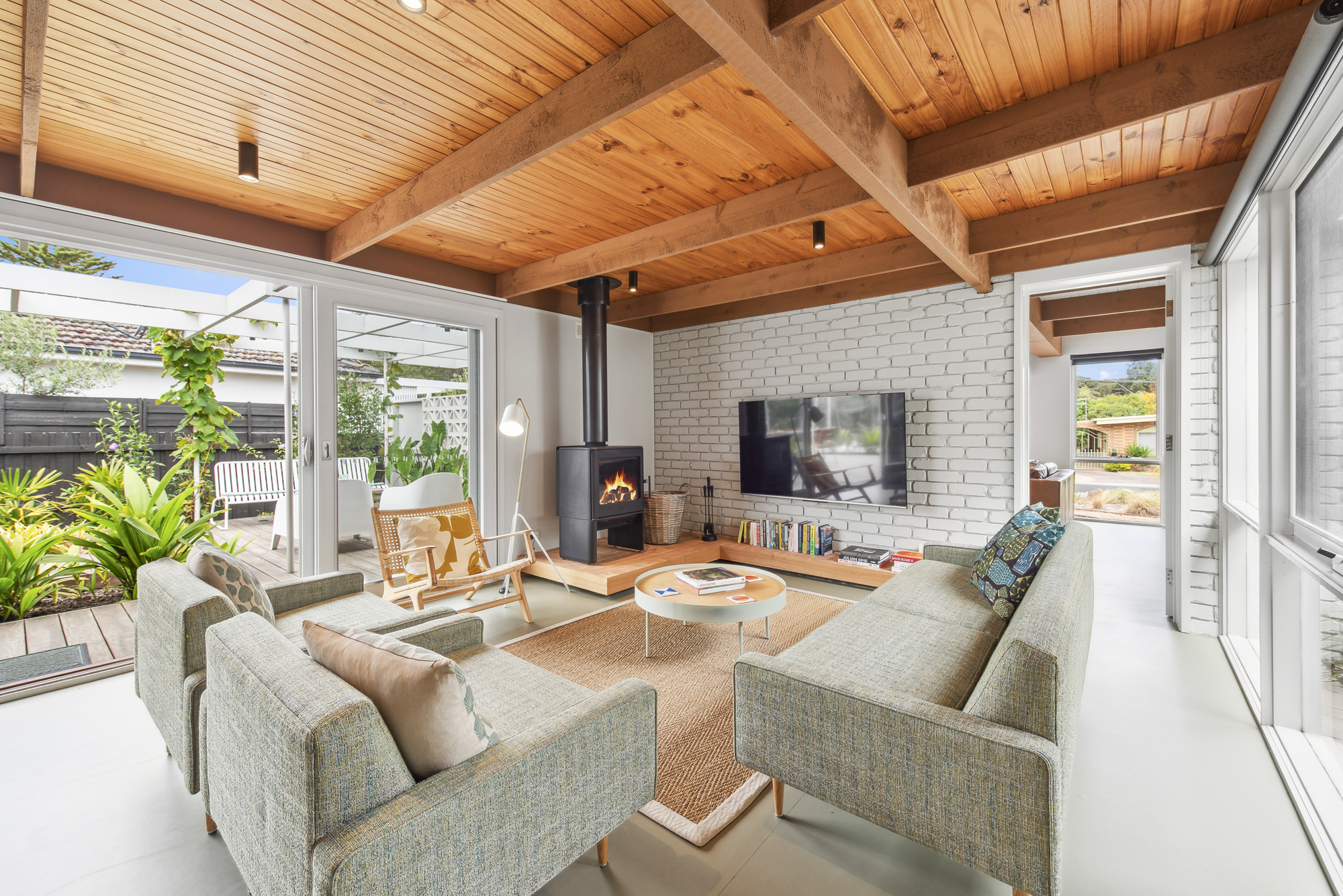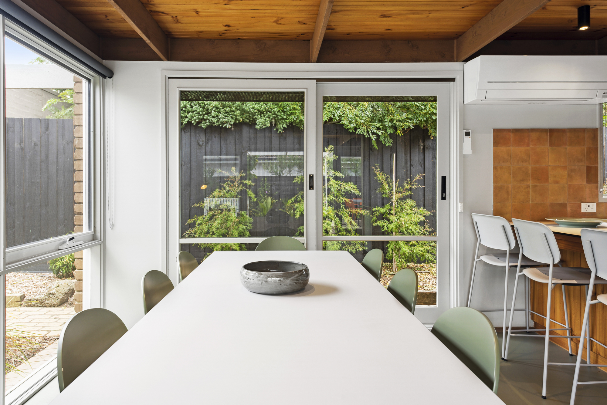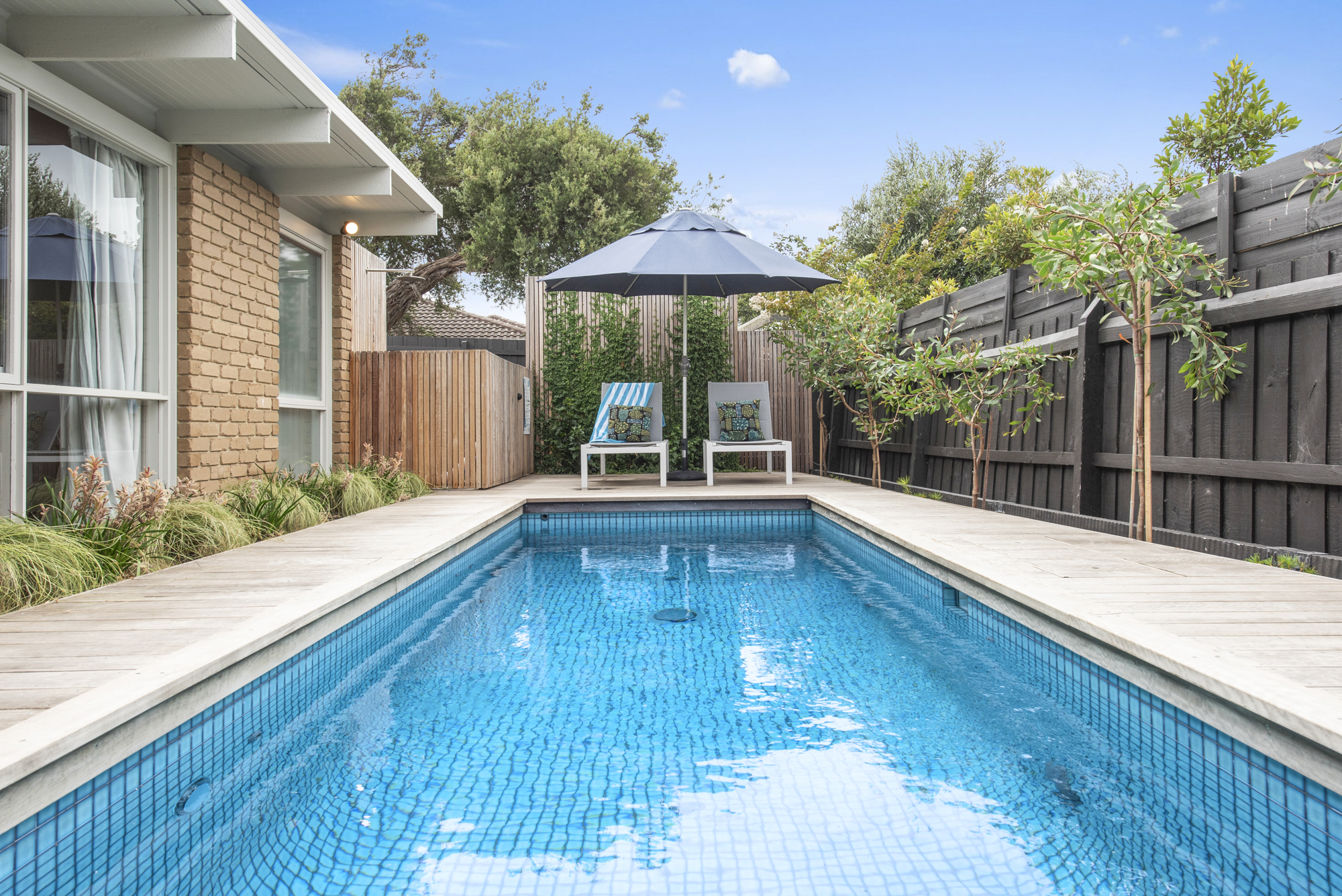 DESCRIPTIONDolphin has been cleverly designed so that most of the house looks out on the pool and lush garden deck. Floor to ceiling windows mean every room is light-filled and connected to the landscaped garden. Our open, calm space has been lovingly restored while retaining its 1970s spirit of easy family living. We have filled it with furniture we love from Australian designers and vintage posters and prints in every room. You enter straight into the open-plan living and dining area, with a wood stove and terracotta-tiled hearth, generous dining table for eight overlooking an internal courtyard, air-conditioning and study or work-from-home nook. The kitchen has been updated with brand new appliances including an induction cooktop, dishwasher, coffee machine and microwave. Sleeping up to 11 guests, there are 4 bedrooms, 2 living spaces, 2 bathrooms (one with a bath), a powder-room and laundry fully equipped with washer and dryer. There is also WiFi throughout. The fully fenced outdoor area is a lovely sun trap with lush planting and an expansive deck around an aquamarine tiled swimming pool and outdoor shower. There is a dining table for eight, a Weber BBQ and a fire-pit for atmospheric winter nights. Dolphin is on the border of Rye and Blairgowrie, in a quiet back street. It is a short walk to the protected bay beach (900m) and Blairgowrie village (1.8k) which has an excellent local IGA, Meatheath butcher, pharmacy and cafes/restaurants including Beachbox for low-key sandwiches, burgers and shakes; Bonnie for stylish breakfasts and evening cocktails and meals; and Blairgowrie Cafe for its famous (and very very good!) ‘ferger burger’. Small dogs are welcome on request. We rent only to families or mature groups. Please note the solar heater in the pool is turned on during the months of November to April and requires the sun to be effective. Visit us on Insta: @dolphin__house ** Due to the strict Shire regulations, we don't accept any bookings for parties, functions, weddings or events, bucks/hens bookings or schoolies groups. We only rent to families i.e. adults and children or smaller mature groups **
