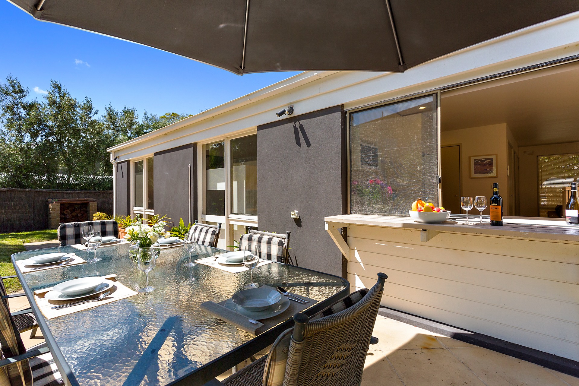 The large living area has a wall mounted plasma TV, open plan kitchen (with microwave, coffee machine and dishwasher) and dining area opening to the courtyard and backyard. There are 2 bathrooms (one with a bath) which makes it suitable for either a 1 or 2 family stay. There is a Smart TV in one of the bedrooms.
