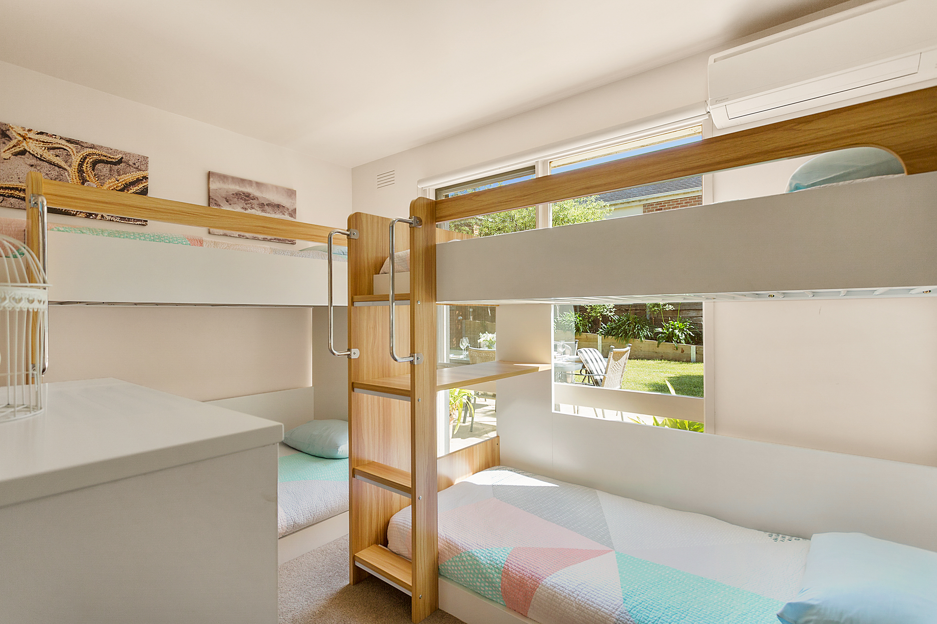 3rd bedroom - 2 sets of bunks (ie sleeps 4 people), split system air con/heater. One set of bunks are single beds and the set of bunks are king single beds.